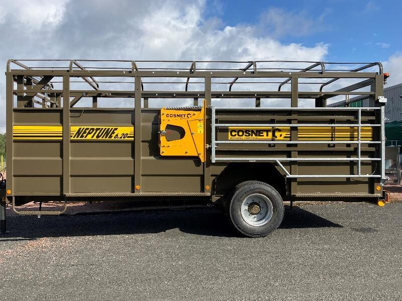| Betaillere NEPTUNE 6.20 COSNET, Longueur de caisse : 6.10m, Poids Vide : 3.14 T Poids PTAC : 10.24 T, Feux leds integres dans le pare-chocs arriere, Cloison interieure peinte coulissante sur rail, Barrieres laterales exterieures sur glissieres avec ressorts, Fond anti derapant en resine, Roues 445/45 R19.5, Bequille hydraulique, Freinage double ligne hydraulique |